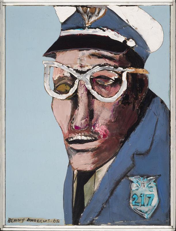 BENNY ANDREWS, “The Cop,” 1968 (oil on canvas with fabric collage). | © Estate of Benny Andrews. Museum Purchase with the Helen and Everett H. Jones Purchase Fund, Licensed by VAGA at Artists Rights Society (ARS), New York