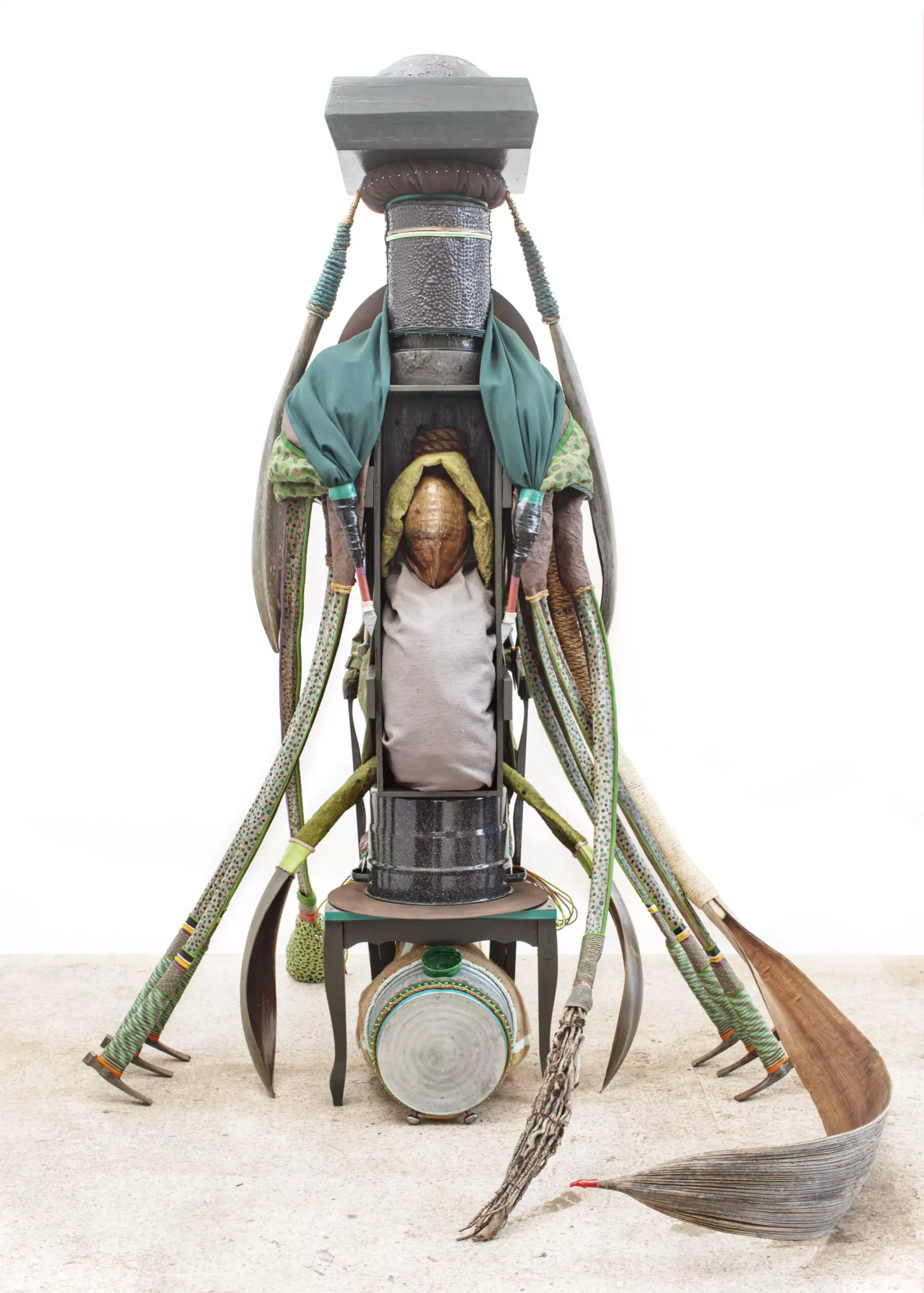 DANIEL LIND RAMOS, (b. 1953, Loíza, Puerto Rico; lives in Loíza), “Figura de Cangrejos,” 2018-19 (steel, aluminum, nails, palm tree branches, dried coconuts, branches, palm tree trunks, burlap, machete, leather, ropes, sequin, awning, plastic ropes, fabric, pins, duct tape, acrylic, 90 × 72 × 82 inches / 228.6 × 182.9 × 208.3 cm). | Collection Benedicta Badía de Nordenstahl