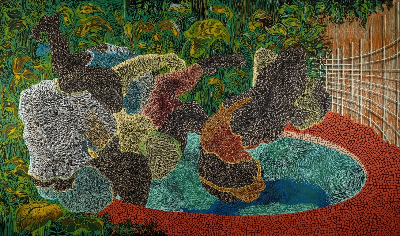 DIDIER WILLIAM, “Mosaic Pool, Miami,” 2021 (acrylic, collage, ink, wood carving on panel, 64 x 104 inches). | © Didier William, Collection of Reginald and Aliya Browne
