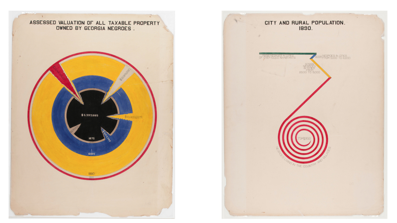 W.E.B DU BOIS, From left, “[The Georgia Negro] Assessed valuation of of all taxable property owned by Georgia Negroes, 1875-1890,” circa 1900 (ink and watercolor on board, 710 x 560 mm) and “[The Georgia Negro] City and rural population. 1890,” circa 1900 (ink and watercolor on board, 710 x 560 mm). | Library of Congress