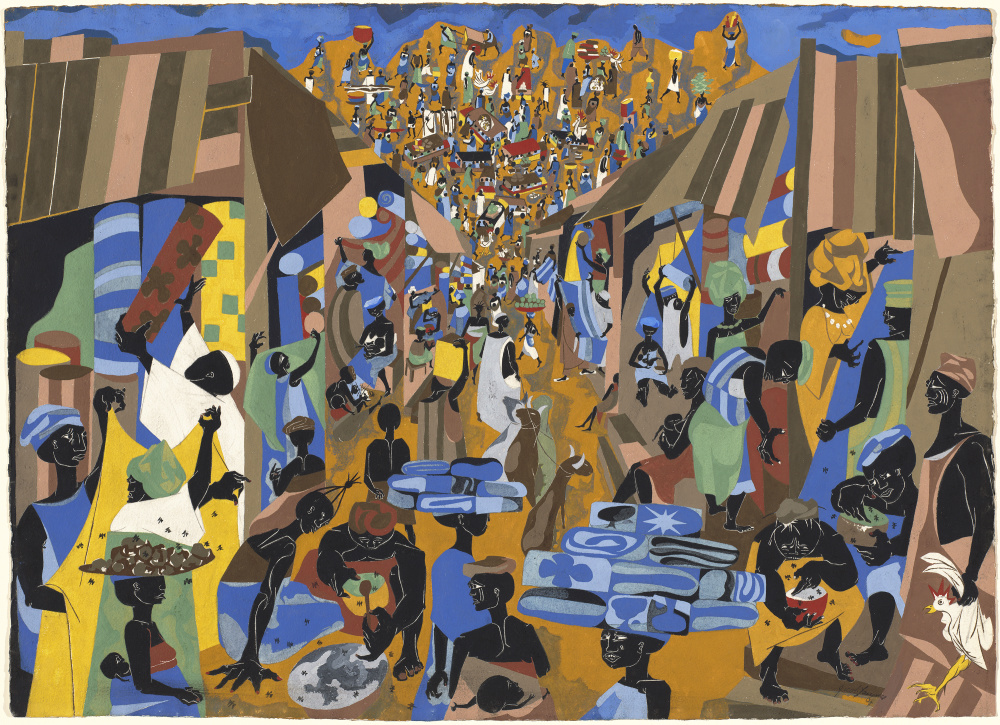 JACOB LAWRENCE (American, 1917-2000), “Street to Mbari,” 1964 (tempera over graphite on wove paper). | National Gallery of Art, Washington, D.C., Gift of Mr. and Mrs. James T. Dyke, 1993.18.1, © Jacob Lawrence / Artists Rights Society (ARS), New York