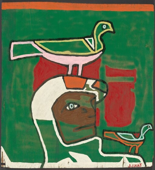 JOE LIGHT, “Birdman Trainer,” 1987 (enamel on wood paneling). | National Gallery of Art, Washington, Patrons’ Permanent Fund and Gift of the Souls Grown Deep Foundation, 2020.28.37