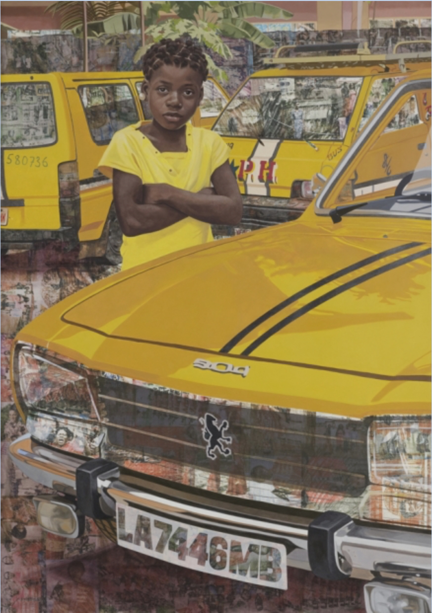 NJIDEKA AKUNYILI CROSBY, “The Beautyful Ones” Series #7, 2018 (acrylic, colored pencil and transfers on paper, 59 7/8 x 42 1/2 inches / 152.1 x 108 cm). | Collection of ICA Boston. Acquired through the generosity of Fotene and Tom Cote in honor of Eve Respini. Courtesy the artist, Victoria Miro, and David Zwirner. © Njideka Akunyili Crosby