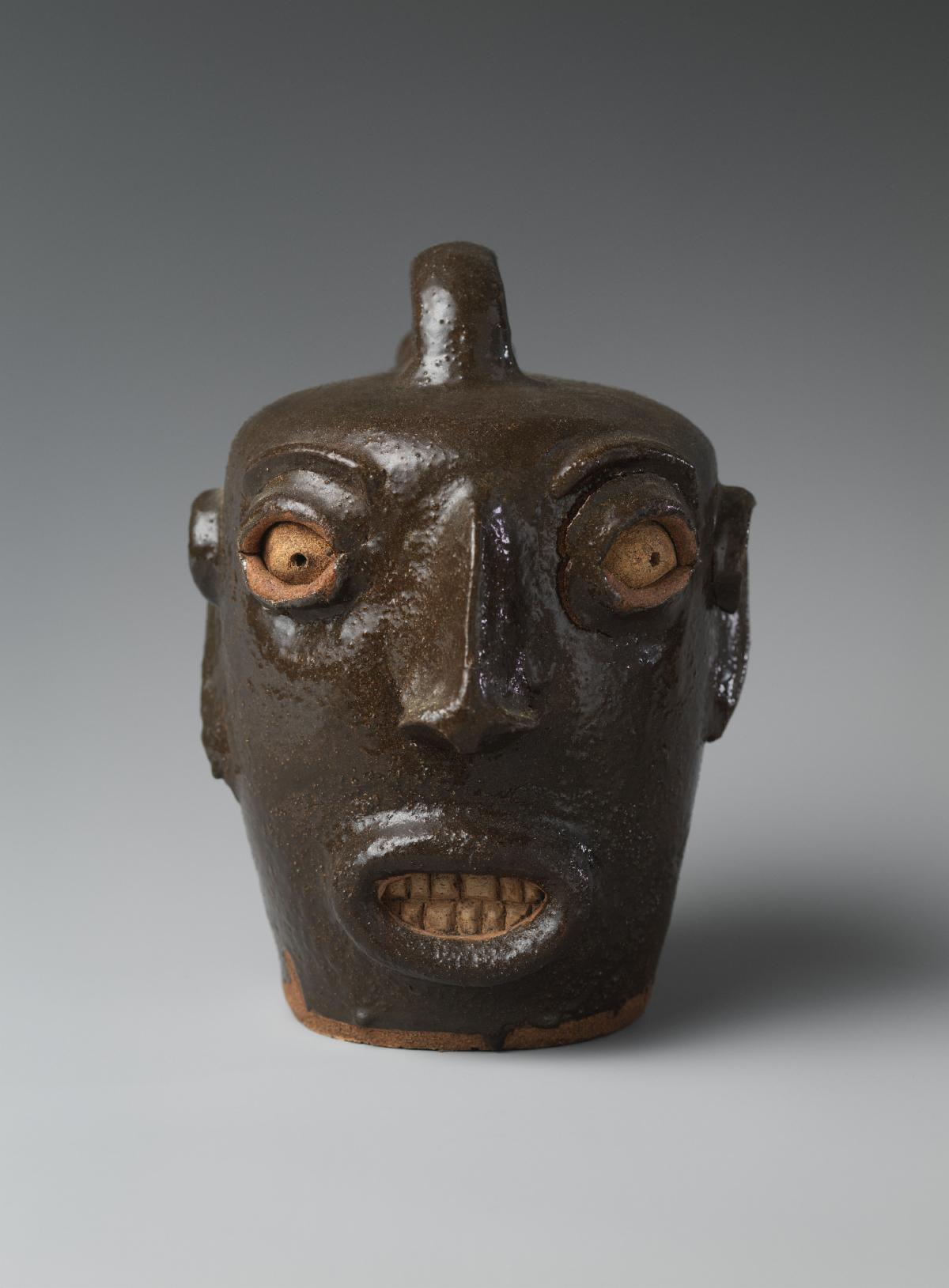 Unrecorded potter, attributed to Miles Mill Pottery (1867–85). Old Edgefield District, South Carolina. Face jug, 1867–85. Alkaline-glazed stoneware with kaolin, H. 8 in. (20.3 cm). Hudgins Family Collection, New York