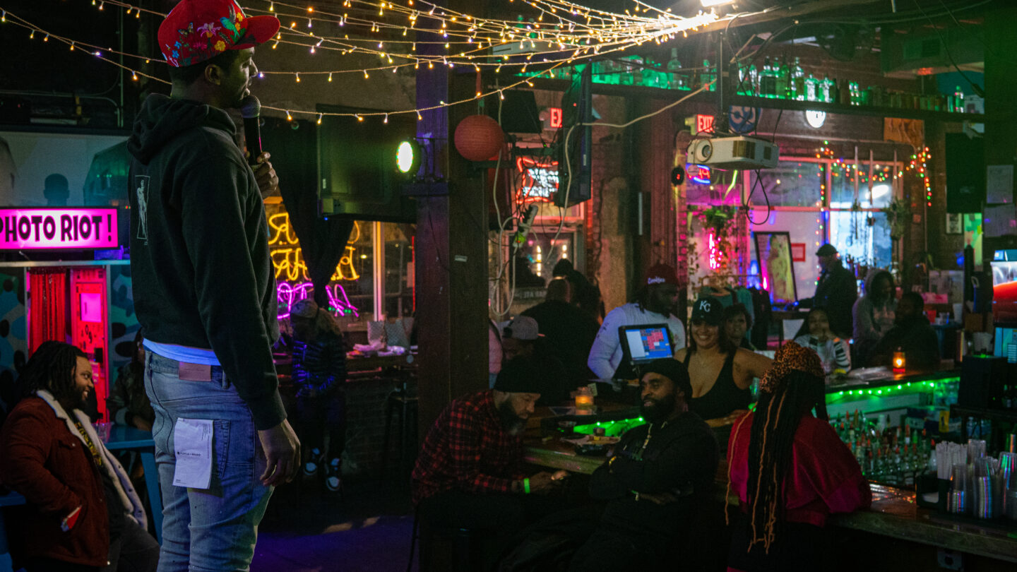 A comedian takes the stage during a comedy night inside Our Bar ATL. (Matthew Pearson/WABE)