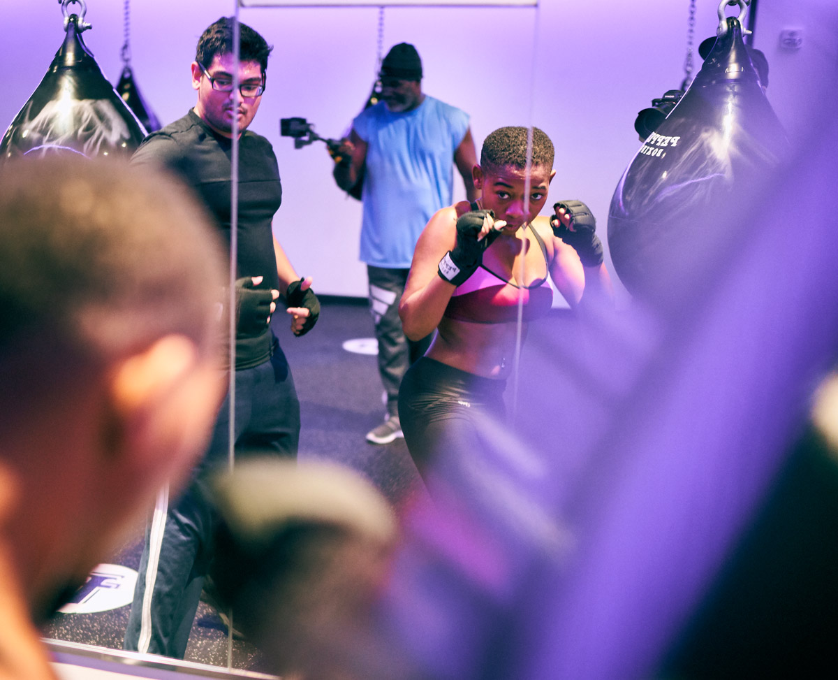 Near SunTrust Park, a new fitness studio combines boxing—with a teardrop-shaped, water-filled heavy bag—and weighted-bar exercises for a full-body workout. The set-up is in a circle, so clients never lose sight of their instructor as they “pepper” the bag, shadowbox, and strength-train for a sweaty, low-lit, high-energy 50 minutes.