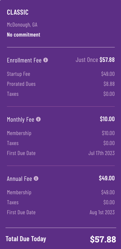 The first payment includes a one-time startup fee and prorated dues (based on my signup date). But the month you sign up will impact your startup fee and how much you pay in prorated dues. Many gyms offer specials around the beginning of the year. For example, in January 2023, the startup fee was only $1, compared to the typical $49 fee. So, I’ve seen the first month’s cost range from $5.93 to $57.88.
