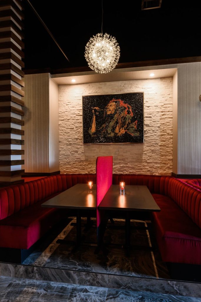 As far as the interior, you’ll find a ruby-red theme with marble floors, dark woods, and oversized and original mixed media works by local Trinidadian artist Andrea Mackenzie adding to the aesthetic of the space.