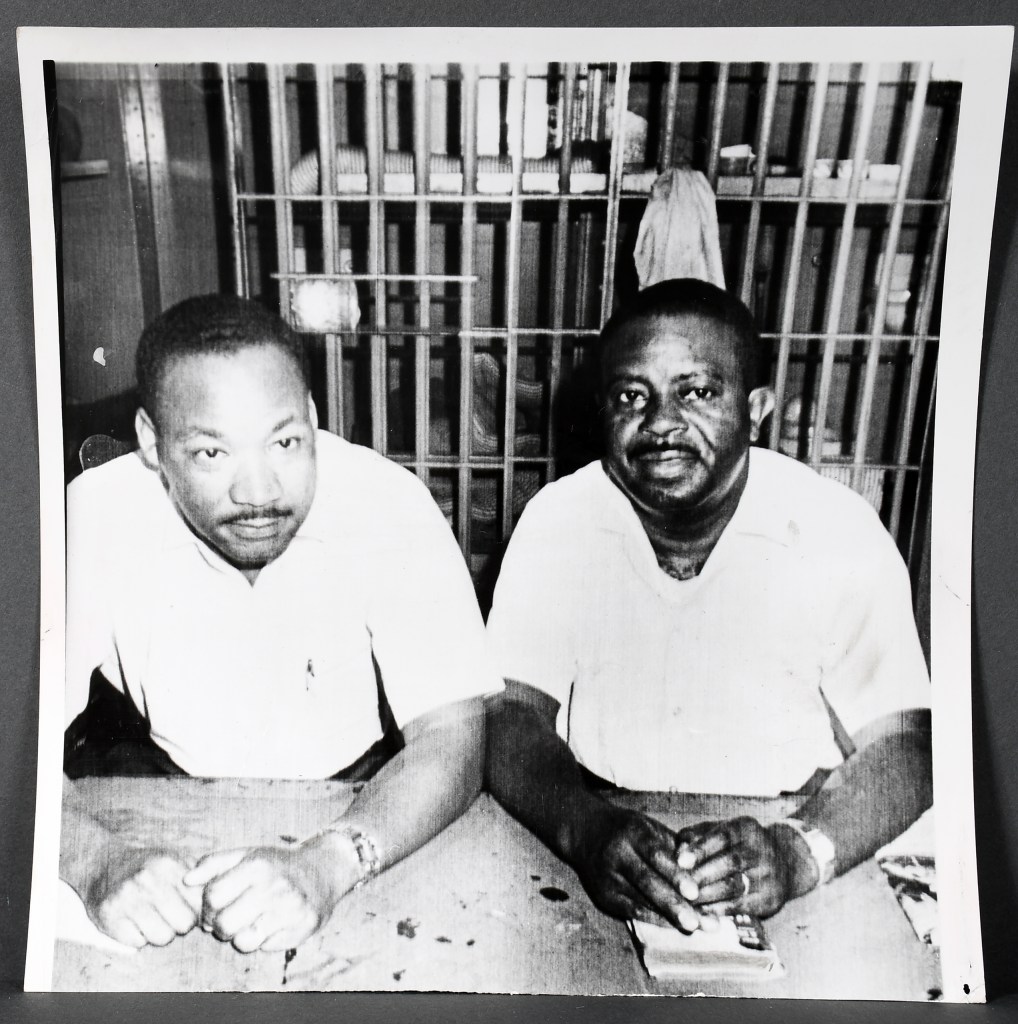 Martin Luther King Jr. and Ralph David Abernathy pictured in jail after pushing Desegregation Drive in Florida, #464. Provided.
