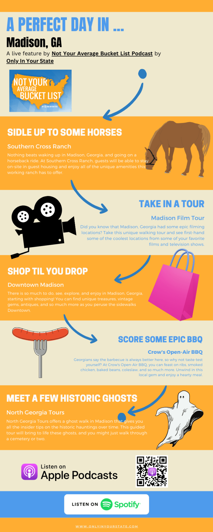 Only In Your State’s podcast Not Your Average Bucket List takes a deep dive into Madison, Georgia and everything it has to offer. Our hosts, Marisa Roman and Sara Heddleston, discuss what their “Perfect Day” in Madison would consist of. From wildlife hiking trails to sleeping in a cottage by the ocean, take a look at the infographic below to get your own suggestions for the perfect day exploring this small town.