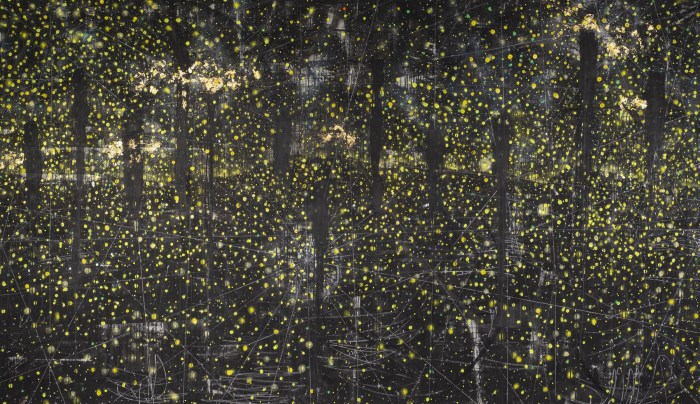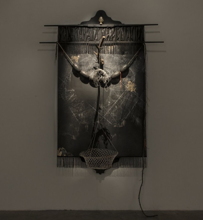His has not been an astronomical rise to the top, but when success found him, it latched on. Since 2015, he’s saturated canvases with black and gold paints, creating abstract works inspired by nautical charts. Now, his work is becoming more concrete, incorporating camping supplies, with items such as lanterns, cast iron skillets and black trash bags hanging from the canvas.